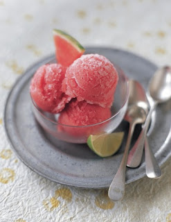 In a small saucepan, heat the water, sugar, and lime juice on medium high for 1 to 2 minutes, stirring until the sugar has dissolved. Chill this “syrup” at least 20 minutes. In the meantime, place the watermelon chunks in a food processor or blender and liquefy them. Add the chilled syrup to the watermelon puree and blend. Freeze sorbet in an ice-cream maker according to manufacturer’s directions. Serve immediately.